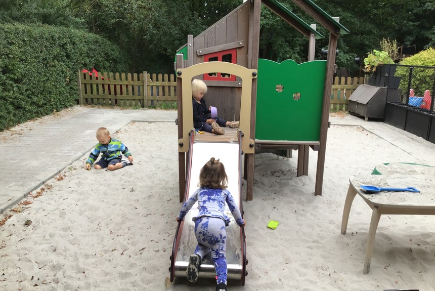 Vi bruger kort og laver skattejagt, så børnene selv skal følge den blå prik m.m., her bliver motorikken og sproget, naturen inddraget.